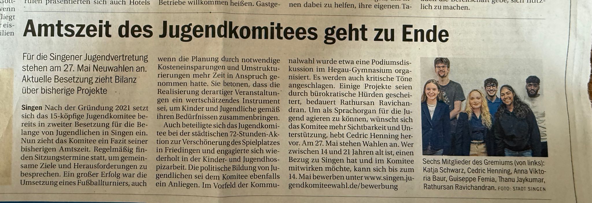 Das Jugendkomitee besteht nun seit 2021. Seitdem konnte es bei der Planung der Pumptrack Anlage dabei sein, bei der 72 Std. Aktion den Spielplatz in Singen-Friedingen mitgestalten, ein Fussballturnier durchführen und eine TOP10 Party frei gestalten. Außerdem haben sie ein Schulkonzept entwickelt, damit mehr Mitsprachrecht in den Schulplanungen eingeführt wird und mitgewirkt bei der Gestaltung des Münchried Areals - eine kostenlose und multifunktionale Sportanlage für Jugendliche.